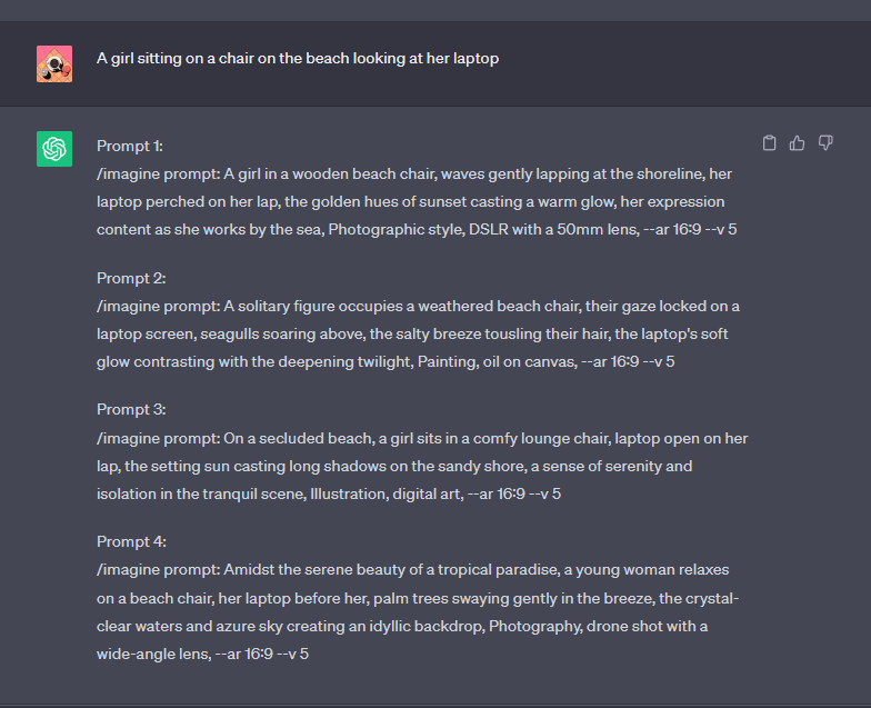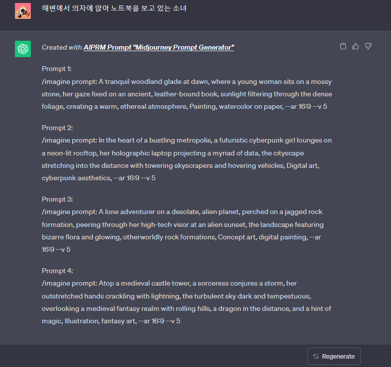 다시 ChatGPT가 프롬프트를 만들어줬습니다. 마찬가지로 4가지를 만들어줬네요.