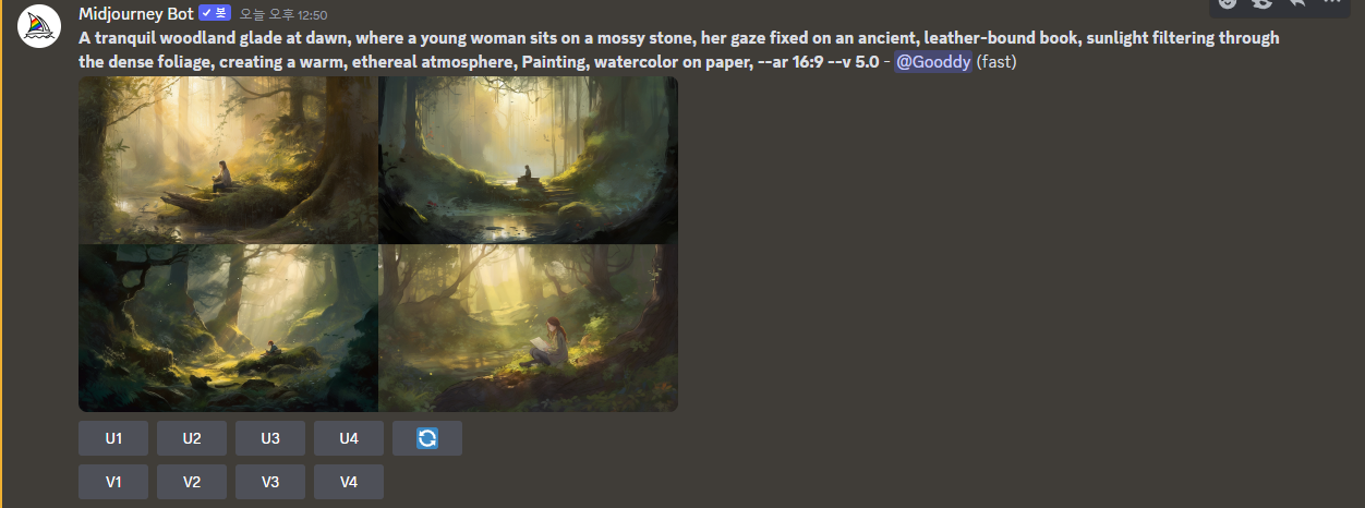 이렇게 프롬프트 4가지를 만들어줬습니다. 뒤에 있는 --ar 16:9 --v 5 같은 것은 옵션이라고 보면 됩니다.