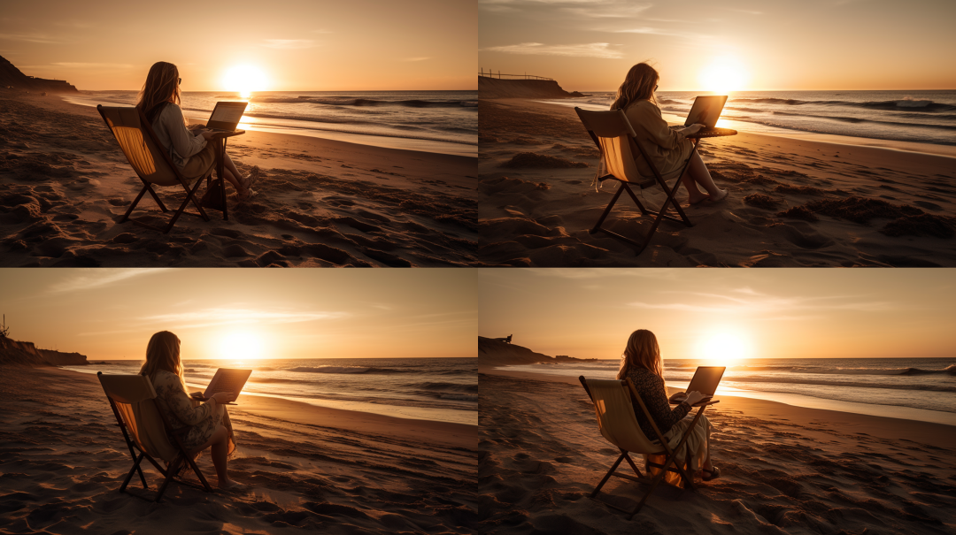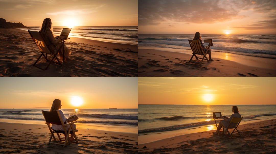 이번 프롬프트를 살펴보면 "beach chair"라는 단어가 보입니다. 또는 "On a secluded beach"도 보이네요. 기대가 됩니다. 미드저니를 통하여 프롬프트 1번 그림을 생성해 보겠습니다.