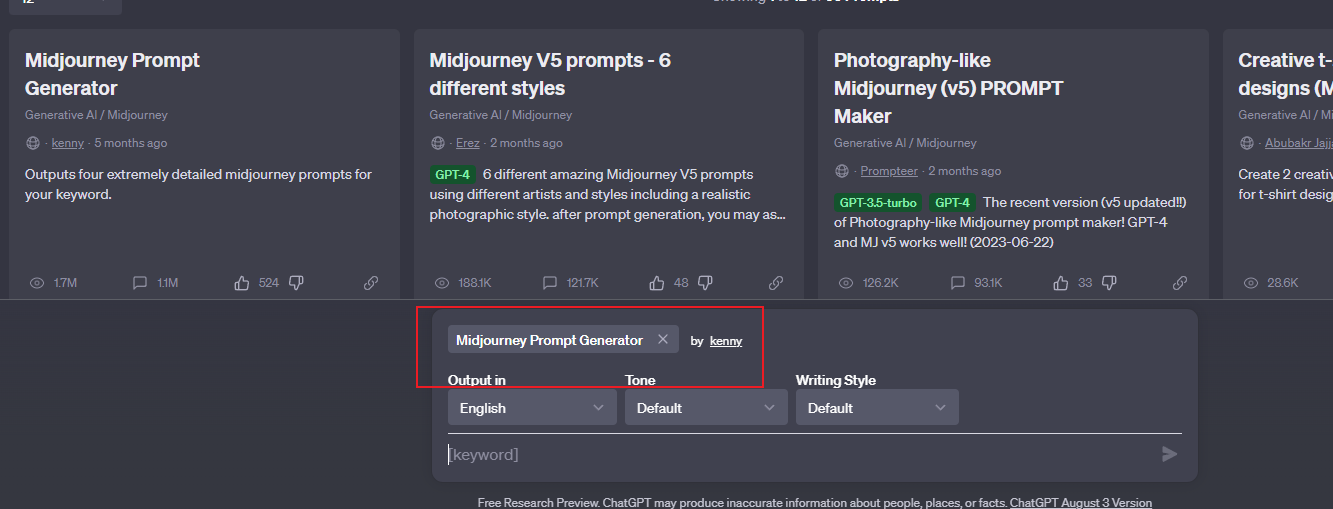 좌측부터 미드저니 프롬프트 제너레이터, 미드저니 V5 프롬프트-6 디프런트 스타일등 다양한 것들이 보입니다. 이 중에 좋아요를 가장 많이 받은 Midjourney Prompt Generator를 선택합니다.