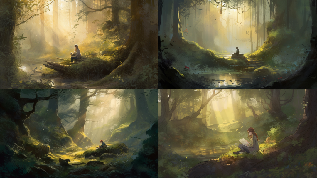 "A tranquil woodland glade at dawn, where a young woman sits on a mossy stone, her gaze fixed on an ancient, leather-bound book, sunlight filtering through the dense foliage, creating a warm, ethereal atmosphere, Painting, watercolor on paper, --ar 16:9 --v 5"