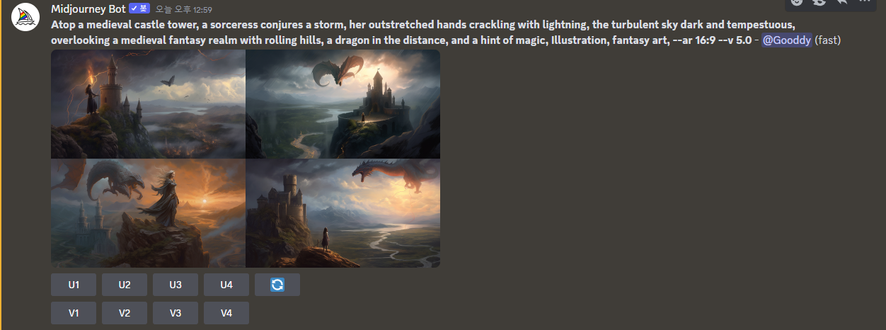 이렇게 프롬프트 4가지를 만들어줬습니다. 뒤에 있는 --ar 16:9 --v 5 같은 것은 옵션이라고 보면 됩니다.