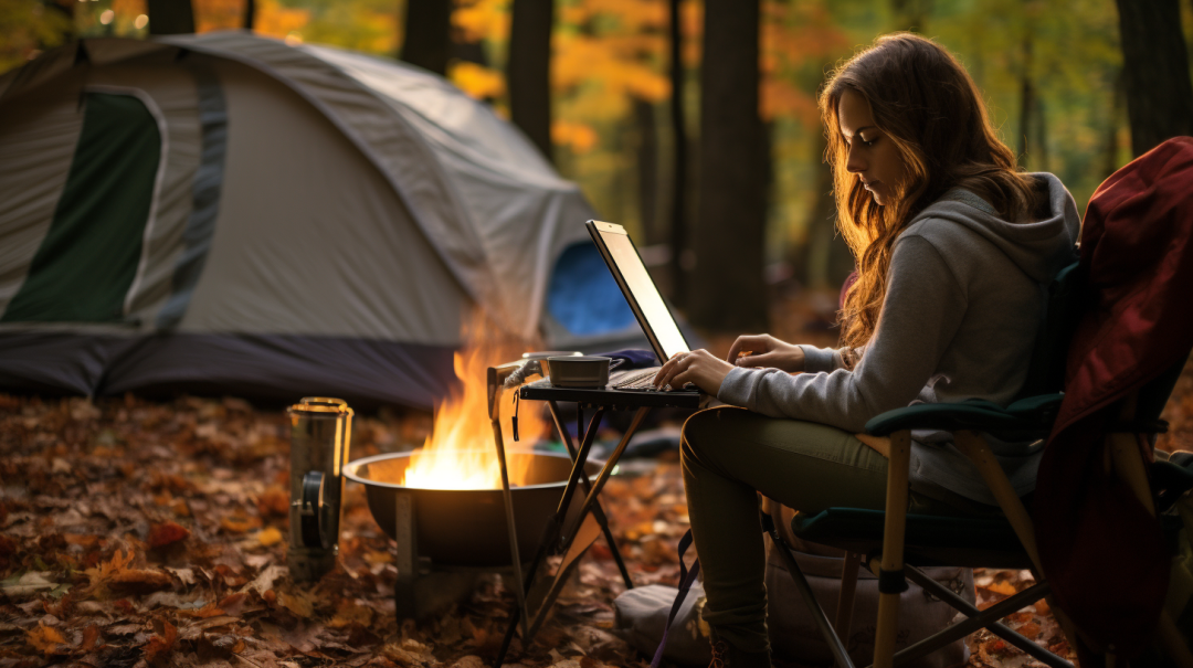 "A girl sitting on a chair on the beach looking at her laptop"