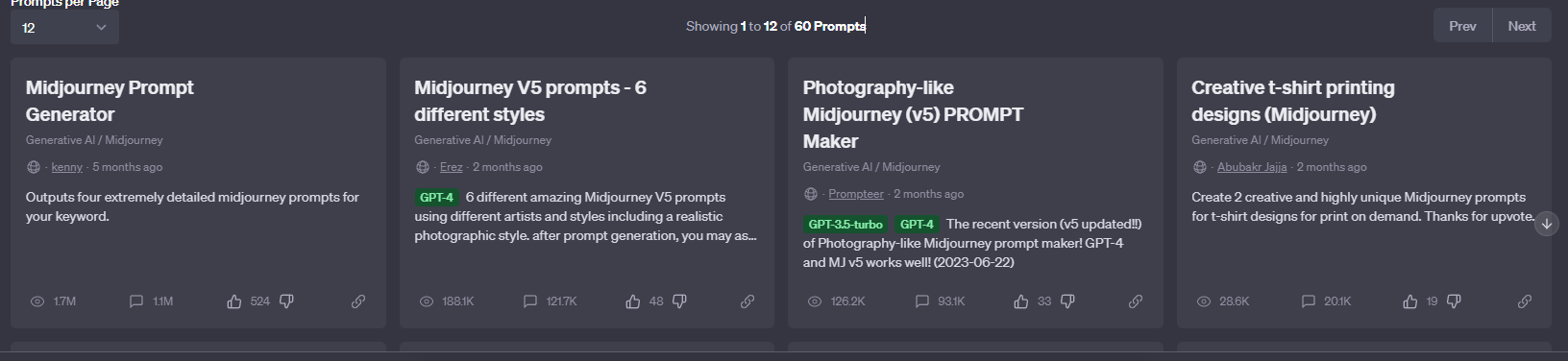 좌측부터 미드저니 프롬프트 제너레이터, 미드저니 V5 프롬프트-6 디프런트 스타일등 다양한 것들이 보입니다. 이 중에 좋아요를 가장 많이 받은 Midjourney Prompt Generator를 선택합니다.