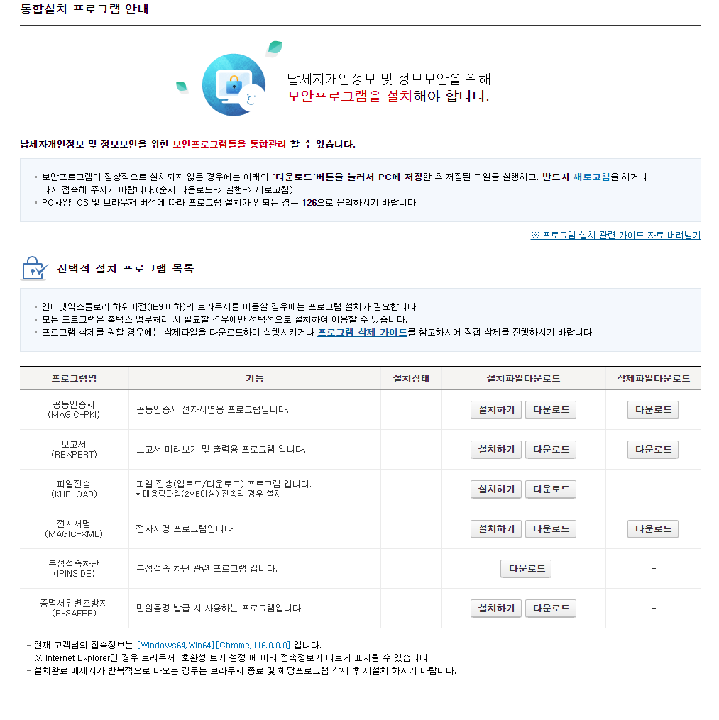 모든 설치가 정상적으로 진행되면 설치상태가 '설치됨'으로 표시됩니다. 이중에 '부정접속차단' 같은 경우는 설치됨으로 표시되어도 설치가 안되었다고 나타나는 경우가 있답니다. 그럴 때는 다운로드를 눌러서 파일을 직접 다운로드하고 열기로 수동 설치를 진행해 주면 됩니다. 다 되었다면 F5 새로고침을 해주세요.
