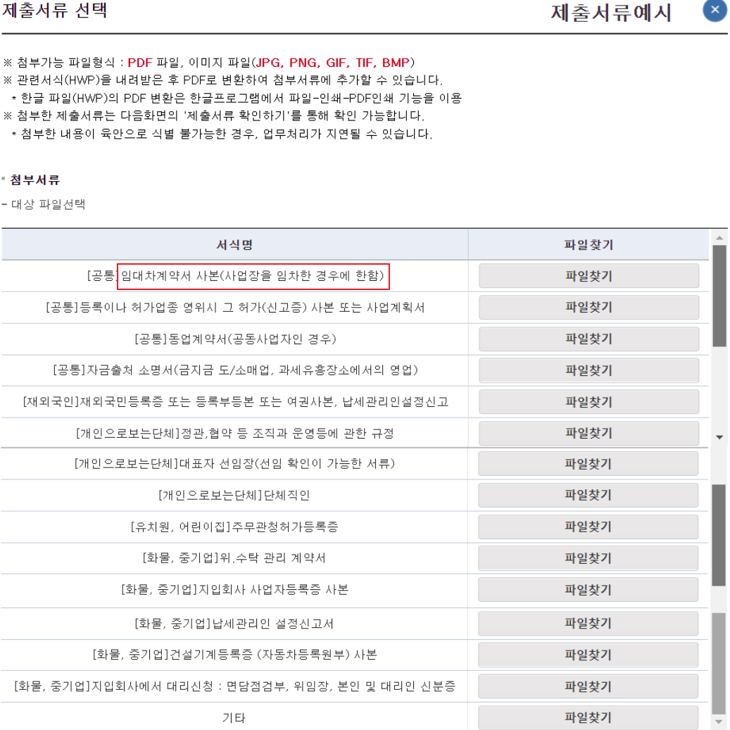 제출서류를 첨부하는 화면입니다. 사업장이 임차인 경우 임대차계약서 사본이 필요합니다. 임대차계약서를 사진 찍어서 파일로 만든 후 첨부하면 됩니다. 보통 임대차계약서를 핸드폰으로 촬영 후 카카오톡을 이용하여 나에게 보내기 합니다. 이후 PC에서 카카오톡 로그인하고 나에게 보내기 한 사진을 다운로드 저장 하면 됩니다.