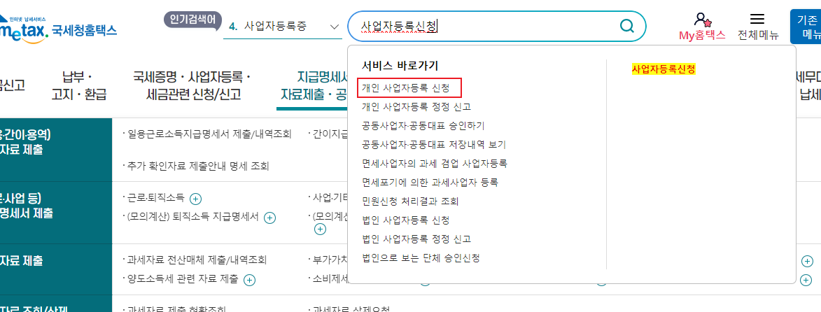 상단 검색창에 "사업자등록신청"을 입력하면 서비스 바로가기 리스트가 나타납니다. 이때 제일 상단에 있는 '개인 사업자등록 신청'을 선택합니다.