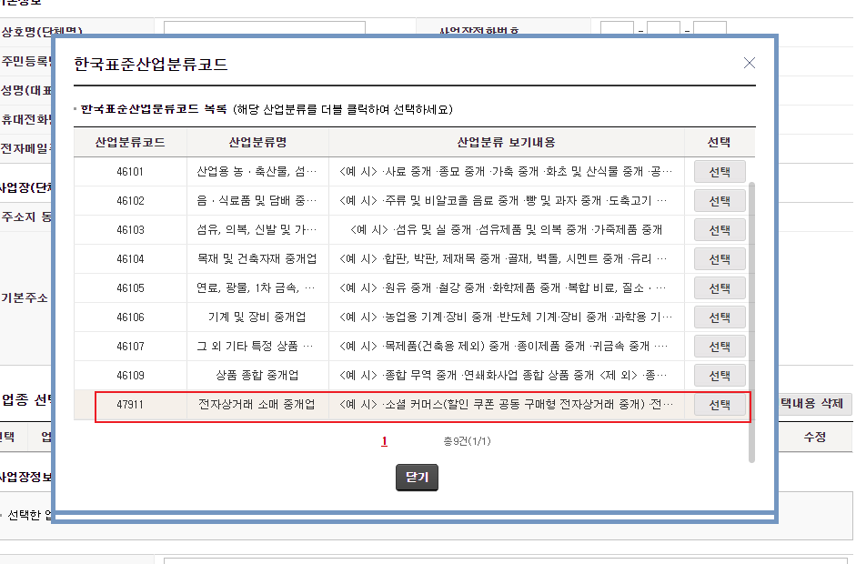 해외직구대행업을 선택했을 때 산업분류코드를 선택하라는 화면이 나타납니다. 가장 아래로 내리면 47911 코드가 있습니다. 이것을 선택하면 됩니다.
