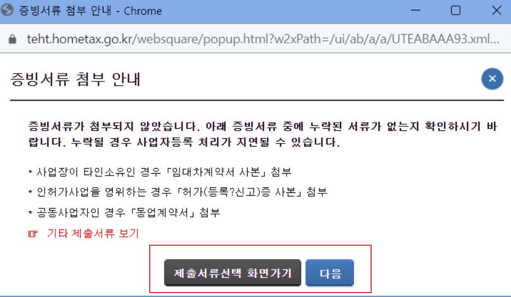 증빙 서류가 필요한 상태인 경우 '증빙서류가 첨부되지 않았습니다.'라는 멘트가 뜹니다. 제출서류선택 화면으로 가서 첨부를 하거나 완료되었다면 다음을 선택합니다.