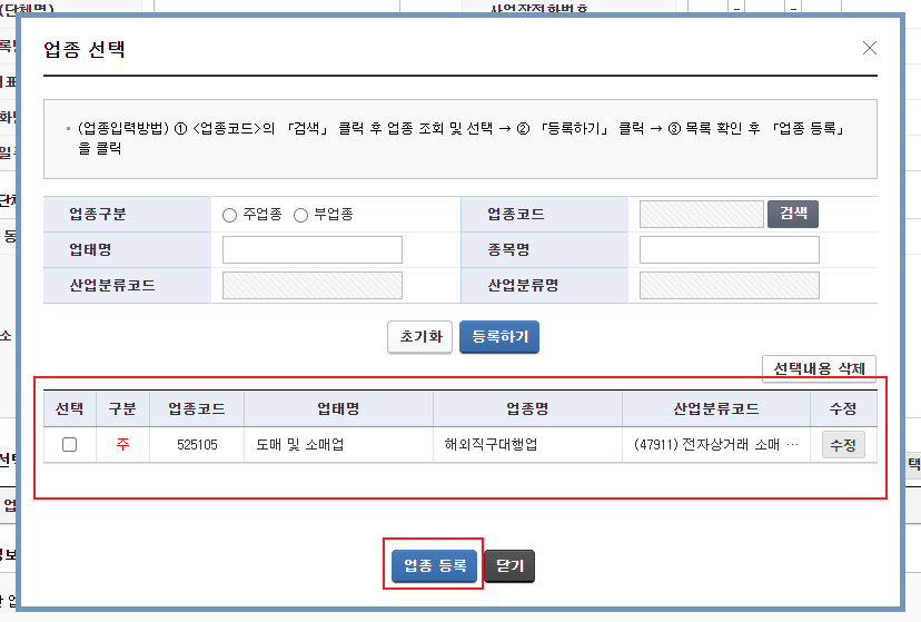 업종코드를 검색하세요. 해외직구대행업은 코드가 '525105'입니다. 코드를 입력하여 검색하면 종목과 산업분류명이 표기됩니다. 등록하기를 선택하여 아래로 내리세요.