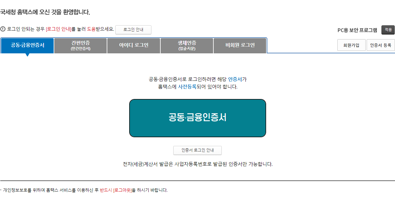 국세청홈택스에 접속하기 위해서는 인증이 필요합니다. 홈택스에 가입 후 인증등록을 하거나 간편 인증을 해주는 게 좋습니다. 홈택스 가입과 인증에 관한 부분은 쉽게 할 수 있으므로 직접 해보세요.