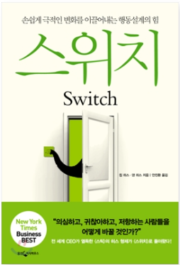 칩과 댄히스 형제의 스위치를 추천받아 얼마 전 읽게 되었습니다. 어떻게 해야 실제로 행동을 변화시키는지 뛰어난 통찰력을 보여주는 책입니다. 특히, 스위치는 단순히 변화하는 과정을 설명하는데 그치지 않고 지금 당장이라도 변화를 시작하는 구체적인 방안을 제시해서 인상적이었습니다. 책을 읽다 보면 제목을 왜 스위치라고 지었는가 이해할 수가 있습니다. 행동의 변화 작은 손짓하나로 충분히 만들어 갈 수 있다는 내용을 담고 있어서 추천드리는 도서입니다. 행동변화에 뜻이 있는 분들에게 꼭 추천드리고 싶습니다.