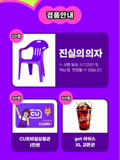 CU편의점에서 이러한 홍보물을 이미 본 사람도 있을 것 같네요! 이벤트에 도전해 본 사람이 있을까요? 이벤트가 오늘까지이니 진실의 의자가 필요한 분은 빠르게 도전해 보시라~