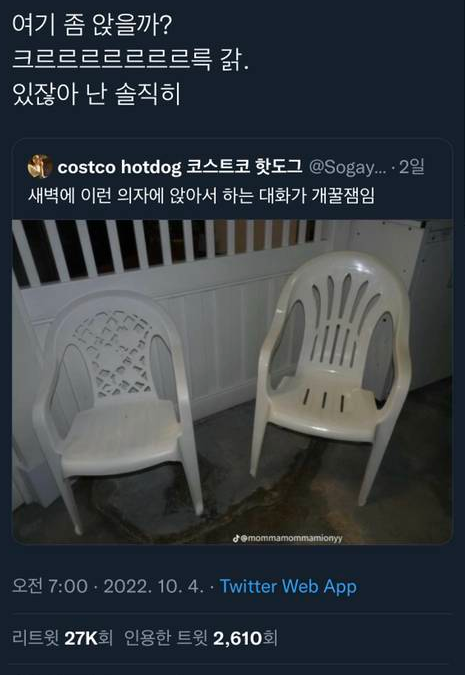 편의점 앞 플라스틱 의자를 끌 때 나는 소리를 표현한 신조어입니다. 진지한 대화를 표현하기도 합니다.