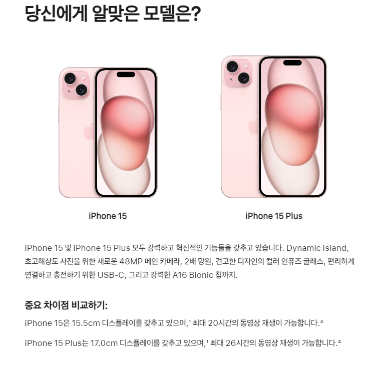 기본 베이스인 아이폰 15와 15 플러스는 화면 크기에서 차이가 있습니다. 15.5cm와 17cm이니 약 1인치 정도의 차이가 있다는 걸 알 수 있습니다. 배터리 시간도 플러스가 약간 증가했습니다.