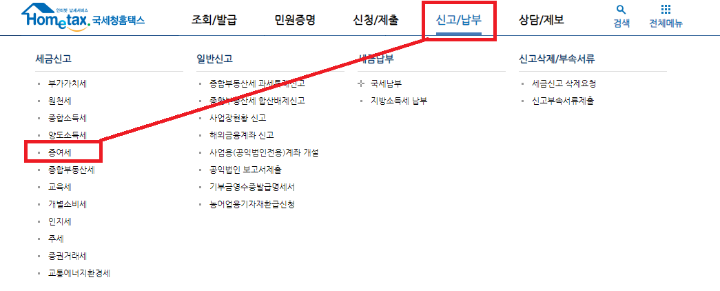 상단 메뉴에서 [신고/납부] 를 클릭하고, 오른쪽 세금신고 항목에서 [증여세] 를 선택합니다.