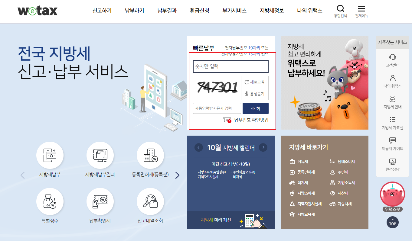 전국 지방세 신고·납부 서비스 국민의 세금, 지역사회 발전을 위해 소중하게 사용하겠습니다. --> 빠른납부 전자납부번호 19자리 또는전자수용가번호 15자리 입력 지방세 쉽고 편리하게 위택스