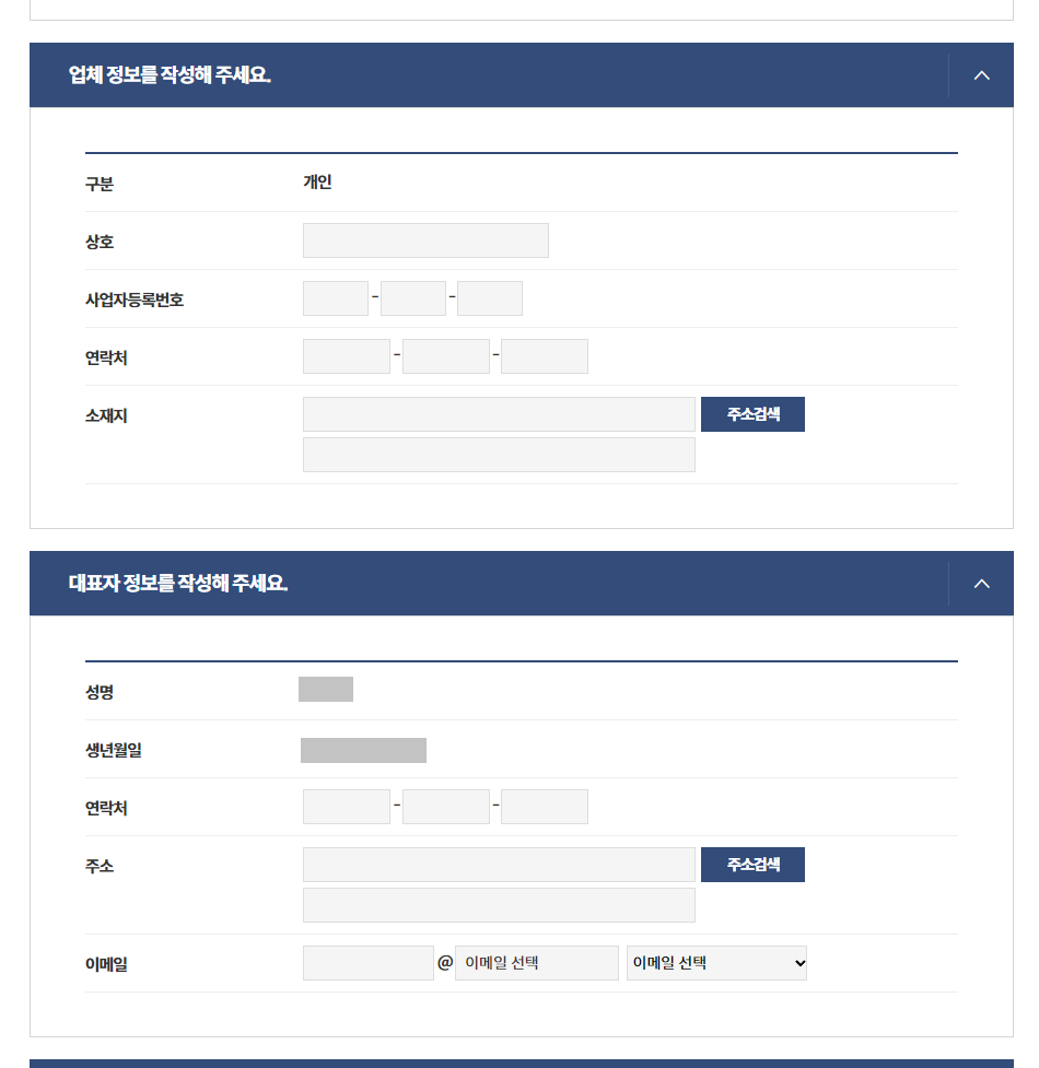 하단으로 내리면 업체 정보와 대표자 정보를 작성해야 합니다. 로그인을 했다면 대표자 정보 중 성명과 생년월일은 자동으로 입력되어 있습니다.