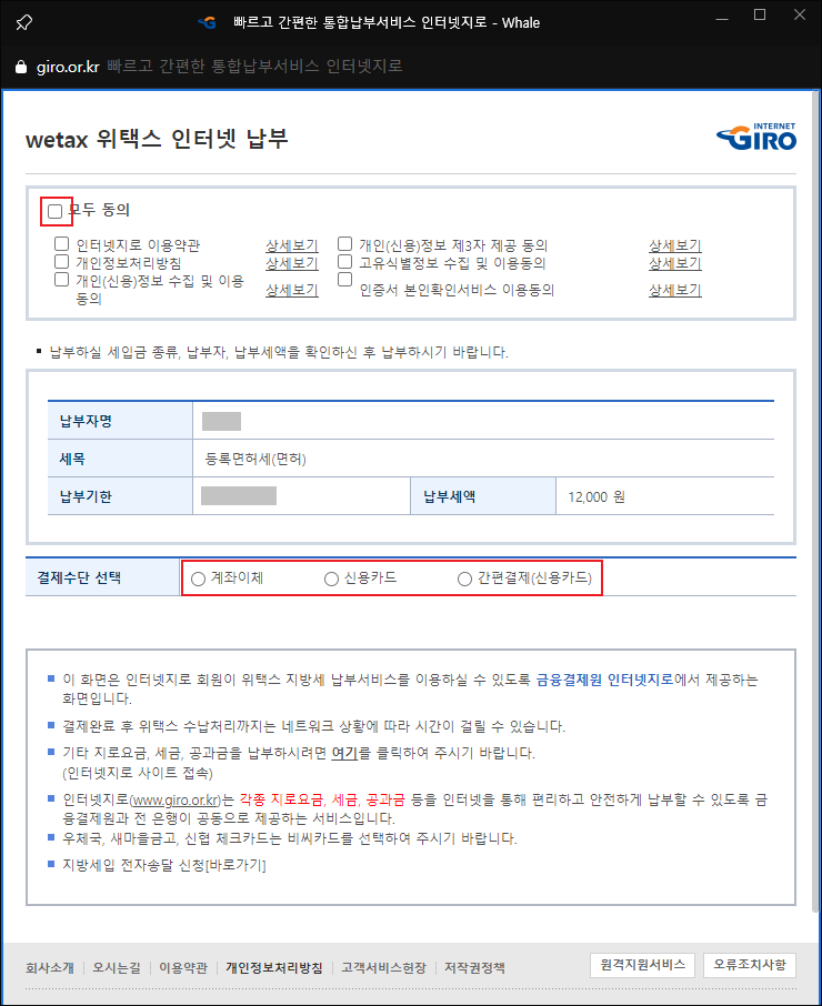 상단 이용동의 '모두 동의' 후 계좌이체, 신용카드, 간편 결제(신용카드)를 선택하고 납부하면 됩니다.