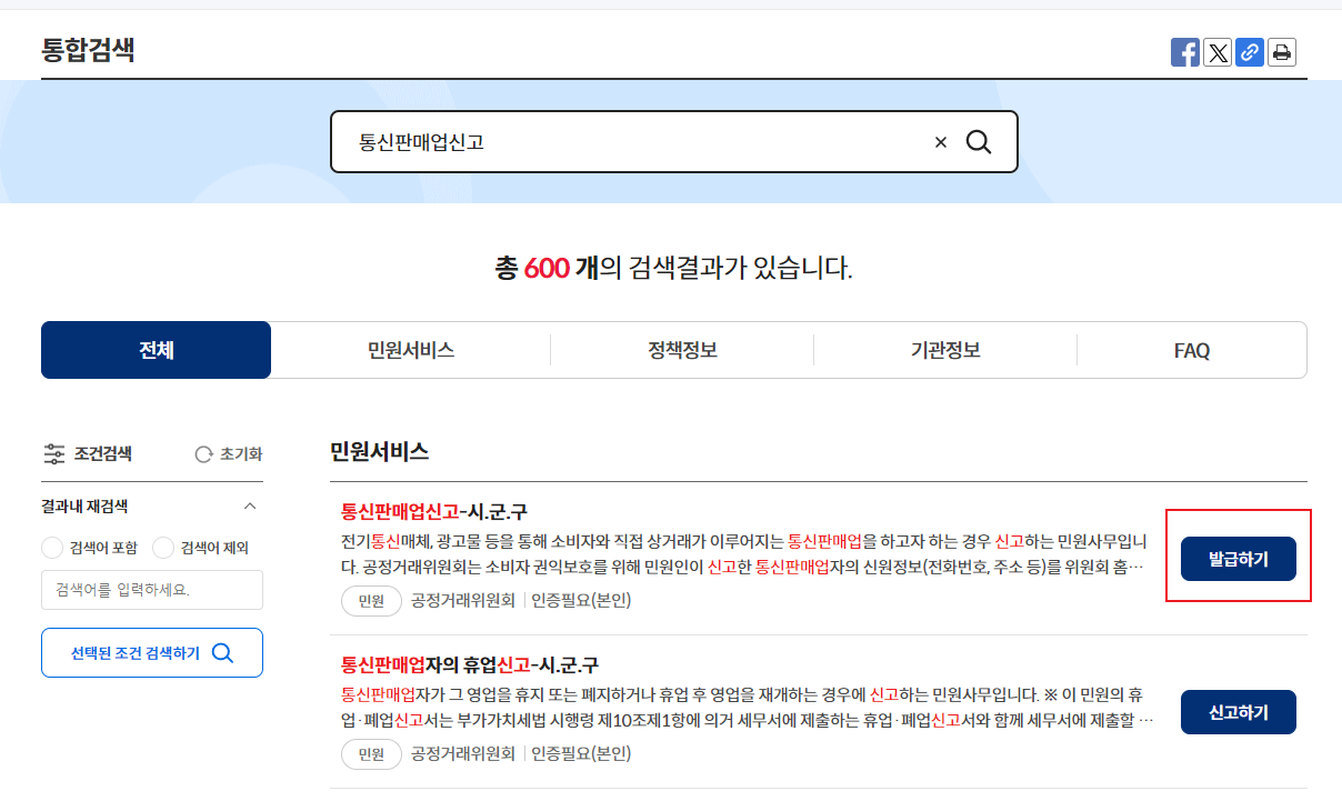 정부 24에서 통신판매업신고를 검색하여 "통신판매업신고 - 시. 군. 구" 발급하기를 선택하세요.