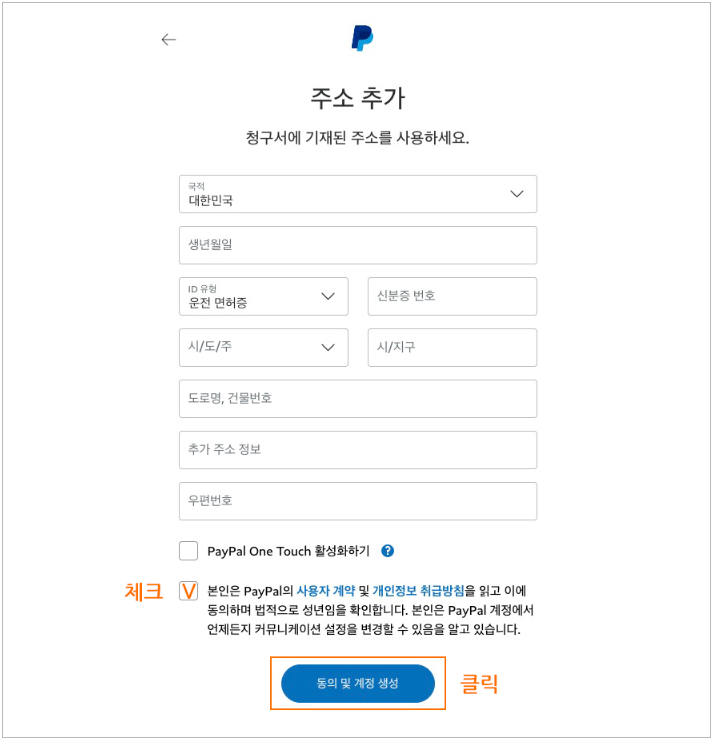 신원을 확인하기 위한 ID 종류는 여권과 운전면허증이 있습니다. 하나를 선택해 입력하고, 생년월일, 주소를 입력한 후 동의 및 계정 생성을 클릭하면 간단히 페이팔에 계정이 만들어집니다.
