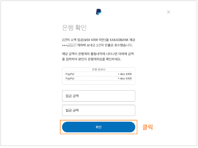 두건의 소액 입금을 은행 계좌에서 확인한 후 페이팔에 입력해 주기 위해 은행 확인을 클릭합니다.