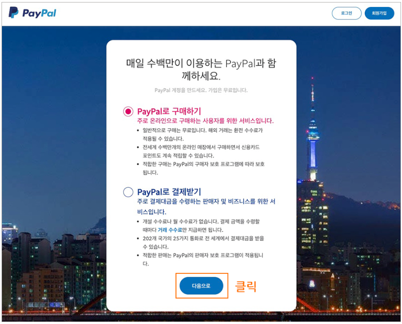 페이팔로 결제 대금을 주고받는 비즈니스 회원으로 가입이 필요한 경우가 아니라면, 일반 회원으로 가입하기 위해 아래와 같이 Paypal로 구매하기를 선택한 후 다음으로를 클릭합니다. 사업자로 페이팔을 가입하는 경우라면 Paypal로 결제받기를 선택 후 다음으로를 클릭합니다. 이번 포스팅에서는 개인가입을 중심으로 설명하겠습니다.
