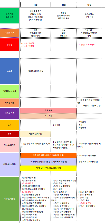 이제 2023년도가 얼마 남지 않았기 때문에 나머지 4/4분기에 해당하는 3개월간 어떠한 이벤트와 흥미로운 마케팅적 행사가 있는지 살펴봅시다.