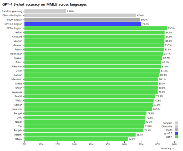 기존의 chatGPT는 영어기반으로 개발되었기 때문에 한국어나 기타 외국어로 질문하였을 때 응답 정확도가 그리 높지 않았습니다. 하지만, 이번 chatGPT4 버전은 공식적으로 한국어, 이탈리아어등 26개국 언어를 추가함으로써 더욱 완벽하고 정확도 높은 대답을 인공지능이 할 수 있게 개발되었습니다.