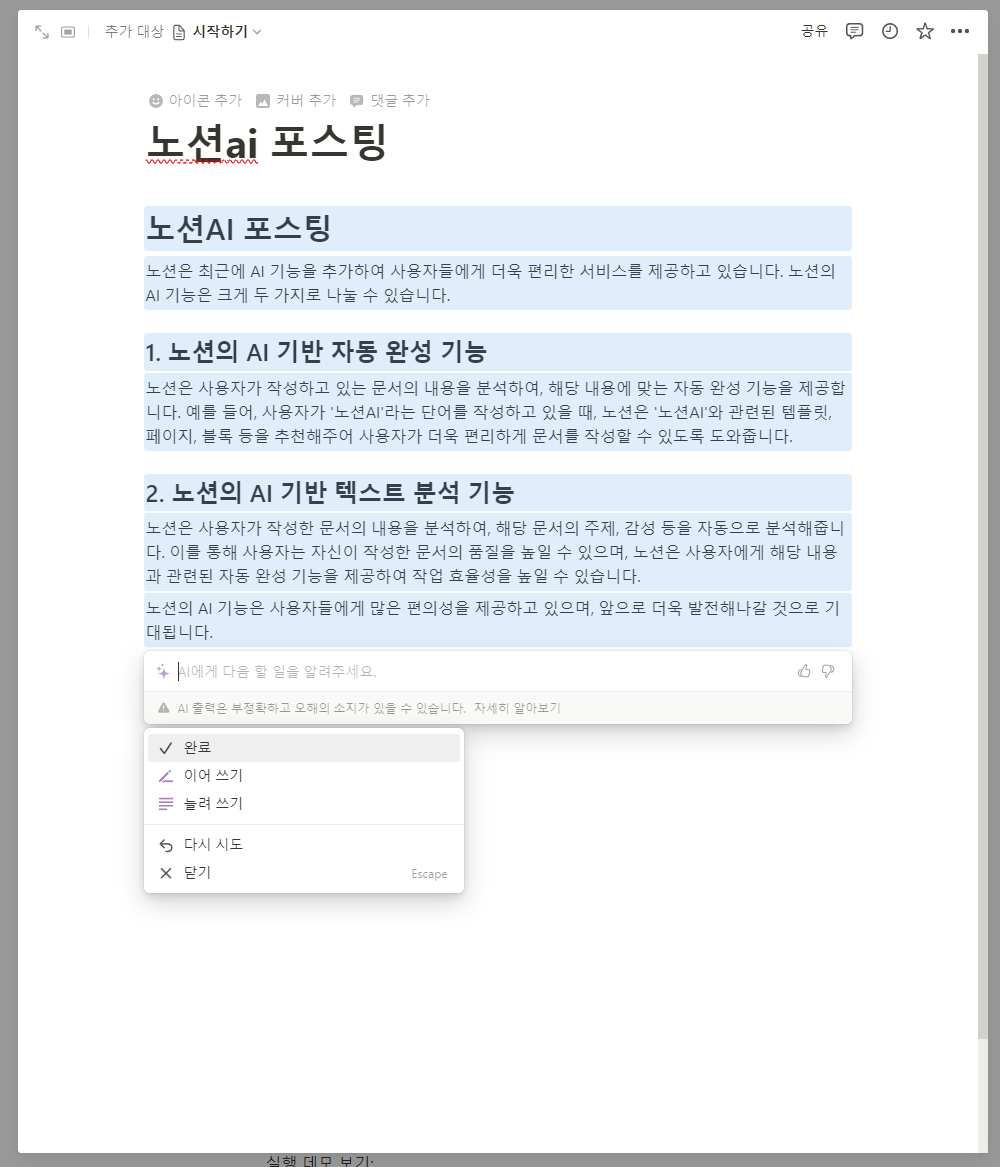 - 자동완성 기능 사용하기: Notion AI는 문장 완성 기능을 제공합니다. 이를 활용하여 글을 작성할 때, 자동완성 기능을 사용하면 작성 시간을 단축할 수 있습니다.